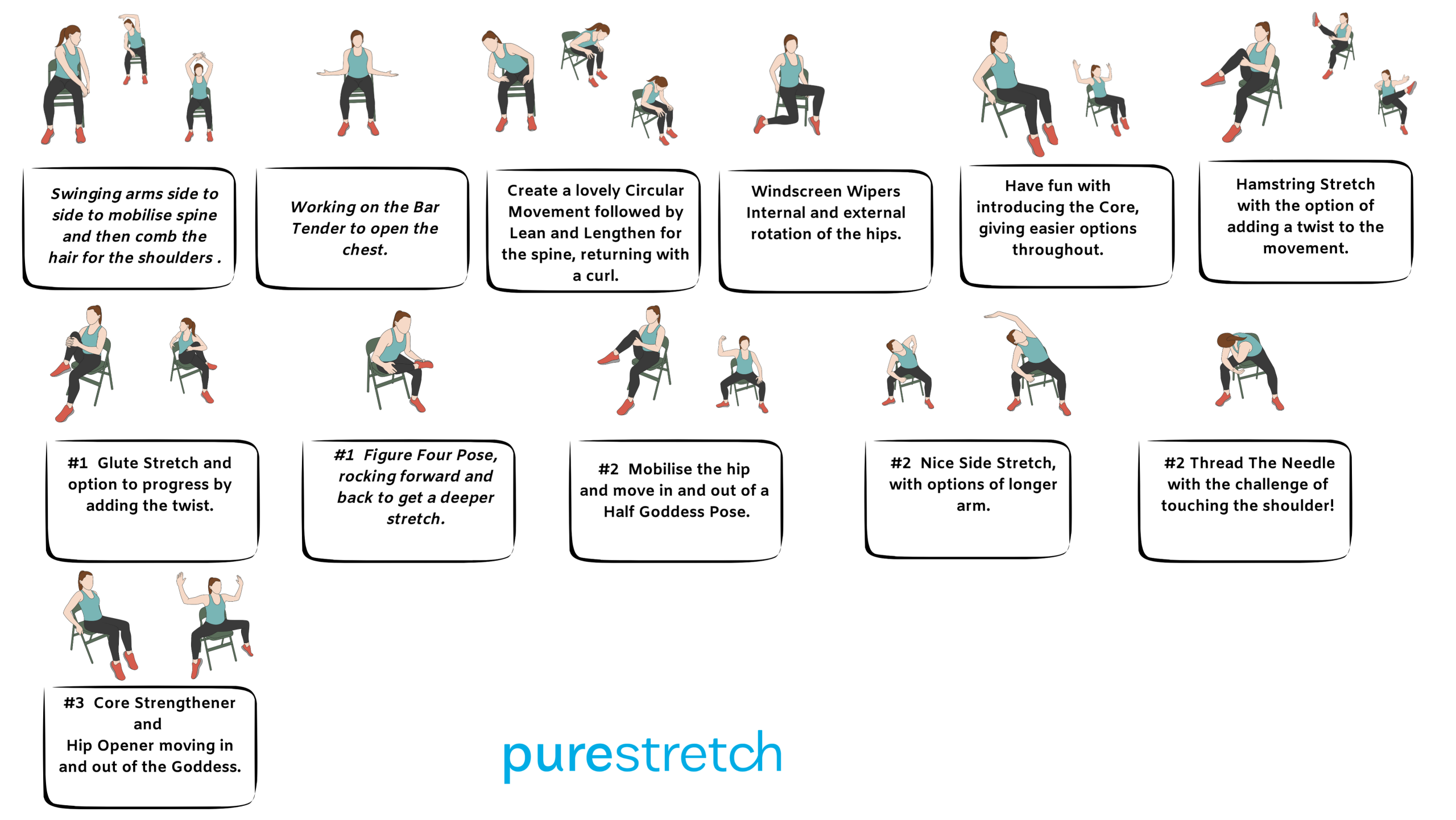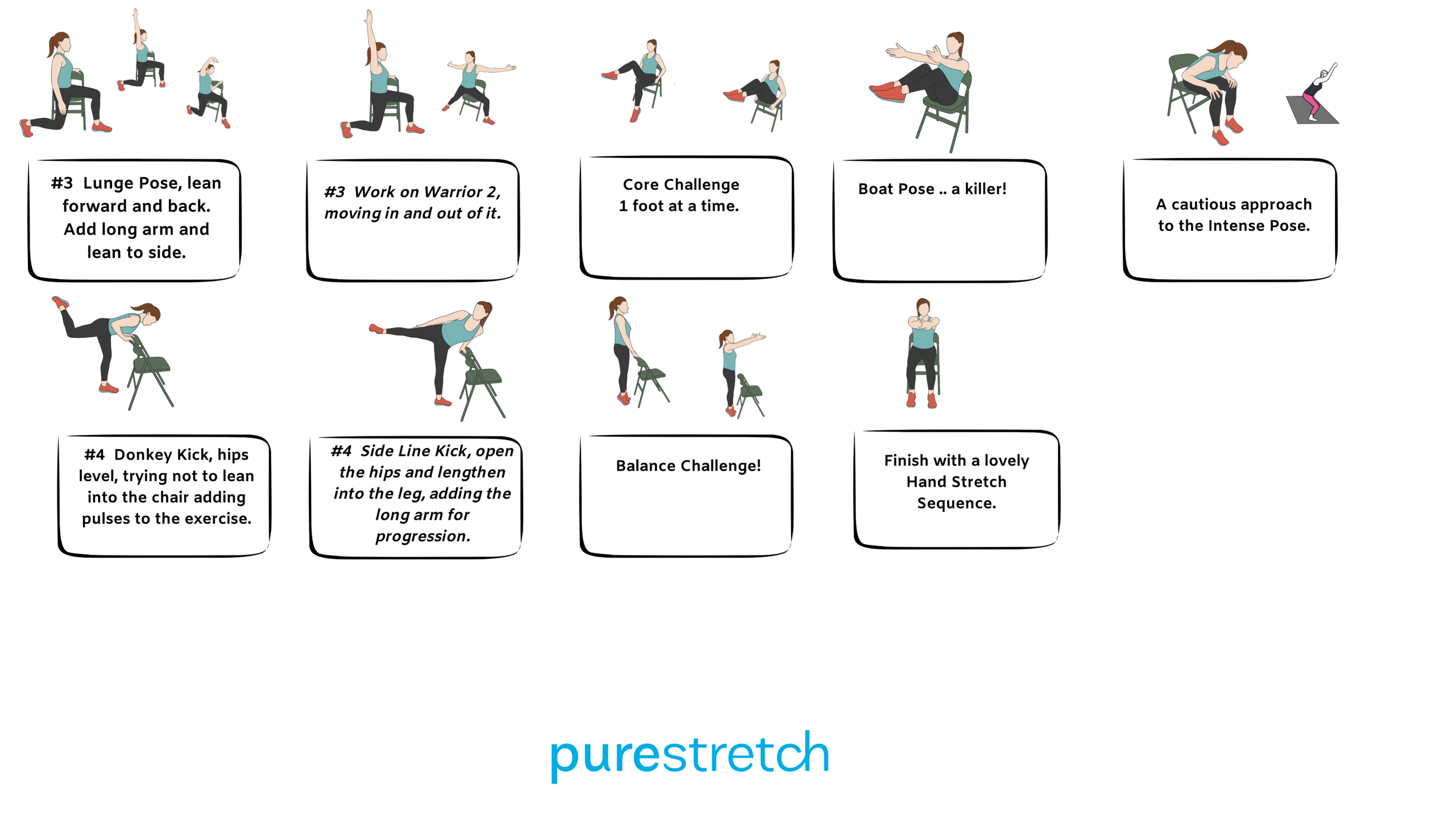 Offer variations and positive reinforcement to create an inclusive environment for different abilities. - “If you’d like more support…” Suggest holding the sides of the chair for balance during exercises like warrior poses, leg raises etc.
